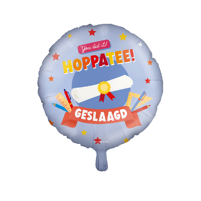 Folieballon met de tekst “Hoppatee geslaagd” De ballon wordt gevuld met helium en aan een gewichtje geleverd. De heliumballon is ongeveer 40cm groot.