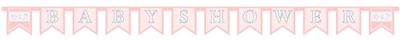 Letterbanner gemaakt van stevig papier met de tekst “babyshower”. De slinger is ongeveer 2.25 mtr lang.