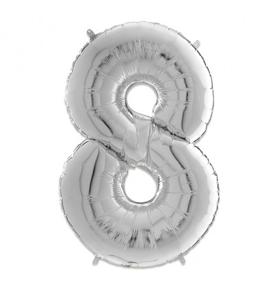 Inloggen| RegistrerenFolieballon in de vorm van een 8 in de kleur zilver met een grote van 65cm, met helium inbegrepen.