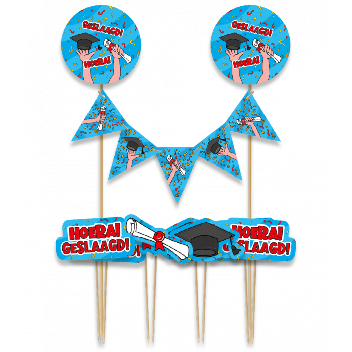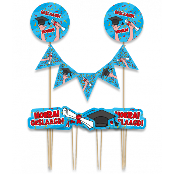 Een set van 1 mini slinger en 8 prikkers. Leuke cake decoratie om zelf een geslaagd taart mee te versieren.