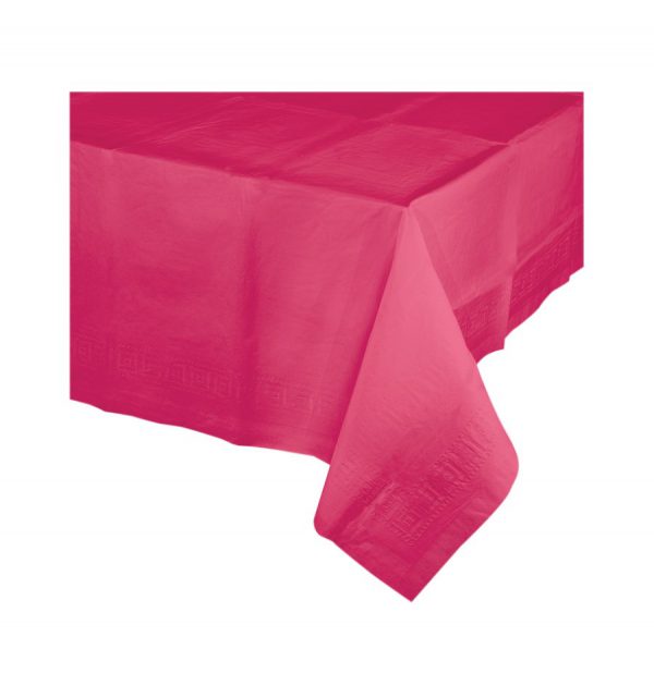 Tafelkleed in de kleur donker roze/fuchsia. Het tafelkleed is gemaakt van dun plastic. De afmetingen zijn 137x270cm.